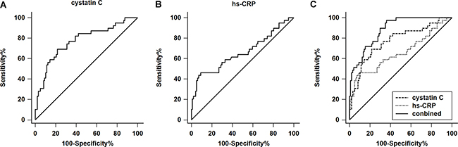 It is likely that no single biomarker will be perfectly predictive, but identifying the optimum combinations to develop risk stratification may determine whether relevant therapies affecting these biomarkers have the potential to reduce mortality. We finally found that the combined use of both cystatin C and hs-CRP levels could increase the sensitivity in assessing long-term mortality up to 97.44%. Therefore, according to our data, it may be reasonable to take both cystatin C and hs-CRP into account as the prognostic markers in patients with ATAAD because of the high sensitivity demonstrated. The data suggesting that if both admission cystatin C and hs-CRP levels were above the cut-off levels in ATAAD patients, the risk of death was significantly increased.