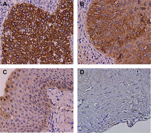 Figure 1: Immunohistochemical staining of SLC22A3 in HNSCC. Representative images of HNSCC show (A) high positive SLC22A3 expression (score = +3) and (B) positive SLC22A3 expression (score = +2) in cancerous tissues and (C) low positive SLC22A3 expression (score = +1) and (D) negative SLC22A3 expression (score = 0) in adjacent noncancerous tissues. Original magnification: ×200.