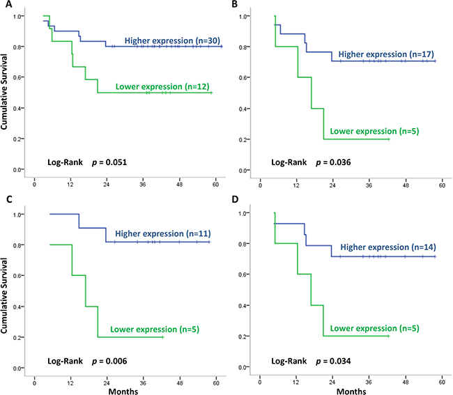 Figure 2: Survival of patients with HNSCC and SLC22A3 expression. (A) Survival of patients with higher SLC22A3 expression (score difference = 1 or 2) and lower SLC22A3 expression (score difference = 0). Patients with higher SLC22A3 expression exhibited improved survival. (B) Survival of patients receiving cisplatin therapy. Patients with higher SLC22A3 expression exhibited improved survival after cisplatin therapy. (C) Survival of advanced T-stage patients receiving cisplatin therapy. Advanced T-stage patients with higher SLC22A3 expression exhibited improved survival after cisplatin therapy. (D) Survival of advanced clinical stage patients receiving cisplatin therapy. Advanced clinical stage patients with higher SLC22A3 expression exhibited improved survival after cisplatin therapy.