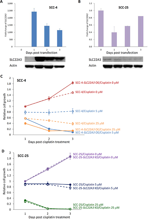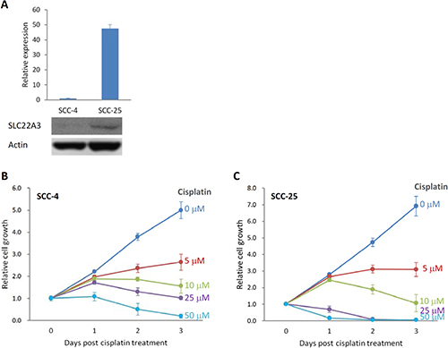 Figure 3: Sensitivity to cisplatin correlated with the level of SLC22A3 expression. (A) SLC22A3 expression was lower in SCC-4 cells but higher in SCC-25 cells, as determined by qRT-PCR (upper panel) and Western blotting (lower panel). The value of SLC22A3 expression in SCC-4 cells is designated 1, and the expression level in SCC-25 cells is related to this value. An MTT assay was performed to examine the effect of cell toxicity for SCC-4 cells (B) and SCC-25 cells (C) after treatment with various concentrations of cisplatin for 3 days. The relative cell growth is presented by comparing the data with day 0. Data are presented as the mean and SE of three independent experiments.