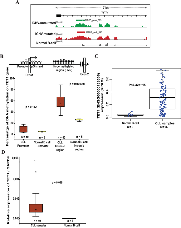 Figure 1: DNA methylation status and TET1 expression levels in CLL samples and normal B cell controls. (A) The illustration represents the methylated peaks enriched regions from IGHV-unmutated and IGHV-mutated CLL samples compared to normal B cell control sample with a p value <0.00001 located between exon1 and exon2 of TET1 gene based on MDB sequencing data. (B) Schematic model illustrating the unmethylated CpG sites at promoter region (represented by white-filled lollipops), black-filled lollipops representing methylated CpG sites on gene body intronic region and location of pyrosequencing primer sets used for analyzing DNA methylation status. Below is the box plot showing the percentage of DNA methylation on TET1 promoter and gene body hypermethylated region between CLL samples and normal B cell samples assessed by pyrosequencing. (C) Box plot showing the differential expression of TET1 analyzed based on independent published RNA sequencing data on 96 CLL patient samples [23]. (D) Box plots showing the expression of TET1 in CLL patient samples (n= 40) compared to the normal B cell samples (n=5) using RT-qPCR analysis.