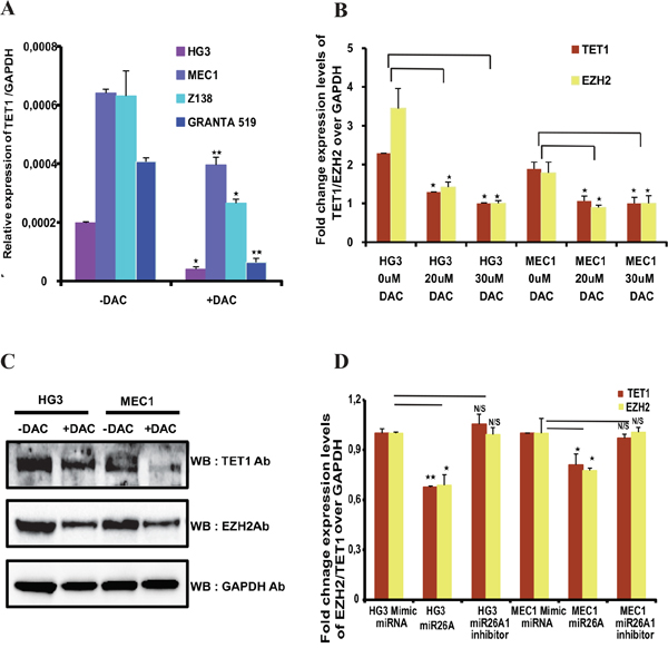 Figure 2: Expression of TET1 and EZH2 after DNA methyl inhibitor treatment and effect of miR26A1 overexpression. (A) Relative mRNA expression levels of TET1 gene over GAPDH in both DNA methylation inhibitor (DAC) treated and untreated CLL cell lines (HG3 & MEC1) and MCL cell lines (GRANTA 519 & Z138). (B) Relative expression levels of TET1 and EZH2 over GAPDH in increasing concentrations of DAC treated HG3 and MEC1 cell lines. (C) Western blot analysis showing protein levels of TET1 and EZH2 in DAC treated and untreated CLL cell line samples. (D) Fold change mRNA expression levels of TET1 and EZH2 over GAPDH in miR26A1 and miR26A1 inhibitor overexpressed CLL cell line samples. The p value significance is indicated as stars compared to control samples (*P < 0.05, **P < 0.005 and NS, not significant).
