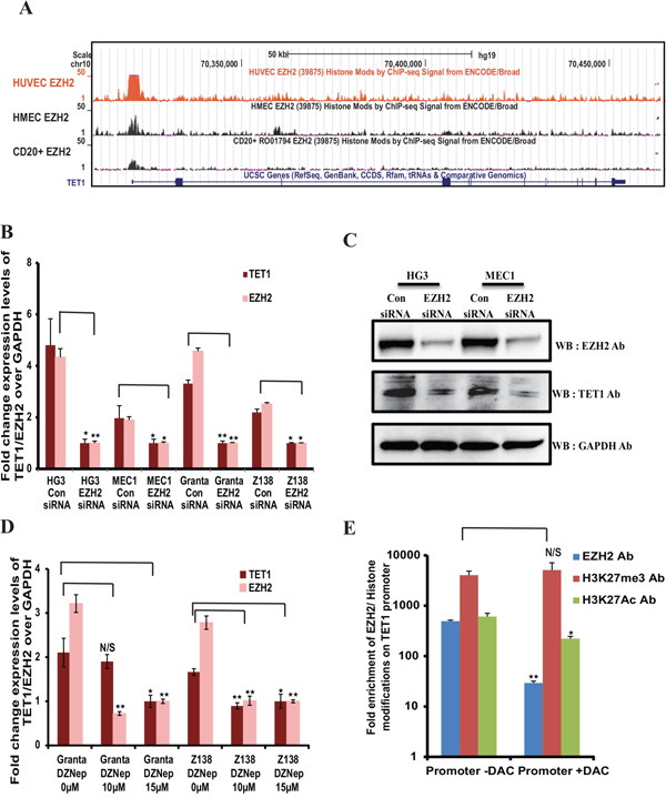 Figure 3: EZH2 dependent expression of TET1. (A) Snapshot of UCSC genome browser in different cell lines from the ENCODE/Broad institute datasets, showing EZH2 binding peaks at TET1 promoter region. (B) Relative expression levels of TET1 and EZH2 over GAPDH in EZH2 siRNA and control siRNA transfected four leukemic cell lines. (C) Western blot analysis showing the protein levels of EZH2 and TET1 in control siRNA and EZH2 siRNA transfected HG3 and MEC1 samples. (D) Fold change expression levels of TET1 and EZH2 over GAPDH in EZH2 downregulated GRANTA 519 and Z138 MCL cell lines, using both siRNA transfections and EZH2 inhibitor (3-Deazaneplanocin) treatment assay (ranging from 0uM to 15uM) respectively. The p value significance is indicated as stars compared to control samples (*P < 0.05, **P < 0.005 and N/S, not significant). (E) ChIP assay showing the fold enrichment of EZH2, H3K27me3 and H2K27ac occupancy at TET1 promoter using DAC treated and untreated MEC1 cell line.
