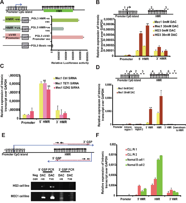Figure 4: Promoter activity of HMR and presence of intronic transcripts within the TET1 gene. (A) The promoter activity of different PGL3 cloned vectors (as shown in the schematic diagram on left side of the graph) transfected in MCF-7 cell line analyzed using Dual luciferase reporter assay. HMR +ve and -ve indicates positive and negative orientation of the sequence cloned with respect to Luciferase gene. (B) Upper panel depicts the model illustrating the TET1 promoter unmethylated CpG island (represented by white-filled lollipops) and HMR (represented by black filled lollipops) showing the location of three different primer sets (1, 2, and 3) used for below intronic transcript RT-qPCR. Below are the graphs showing the relative expression levels of intronic transcripts over GAPDH on the specified locations of TET1 gene for DAC treated untreated CLL cell line samples. (C) Relative expression levels of intronic transcript over GAPDH as mentioned above using EZH2 and TET1 siRNA samples compared to control siRNA transfected CLL cell line samples. (D) Graph showing the relative expression levels of intronic transcripts in MEC1 DAC treated and untreated samples using 7 different primer sets located between TET1 peak region and promoter region of TET1 gene. The location of these primer sets on TET1 gene is indicated in the above illustrated diagram with numbers (1 to 7). (E) Detection of anti-sense intronic transcript of TET1 gene using Reverse Transcription PCR. 5’ Gene specific primer (GSP) and 3’GSP are designed for specifically synthesizing cDNA from lower anti-sense strand and upper sense strand respectively. Lanes 1 to 5 shows the PCR amplified products from 5’GSP and 3’GSP cDNA synthesis using DAC treated and untreated CLL cell line samples (upper panel shows HG3 samples and lower panel shows MEC1 samples). The negative control indicates the sample with cDNA synthesized without any GSP primer. The location of GSP primers and the primer sets used for amplification after cDNA synthesis are indicated in the above illustrated schematic diagram. (F) Relative expression levels of intronic transcript over GAPDH using two CLL samples and two normal B cell samples at TET1 gene promoter and HMR regions.