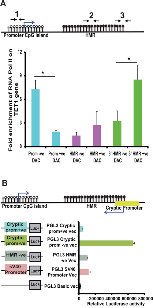 Thus, our data clearly demonstrate the presence of a methylation dependent cryptic promoter at HMR located in the intron 1 of TET1, which encode antisense transcripts spanning across the HMR of its sense counterpart TET1. We next wanted to investigate whether induction of cryptic promoter activity has any functional connection to the TET1 promoter activity upon DAC treatment. To this end, ChIP assay was performed on TET1 promoter TSS site, HMR region and downstream to HMR region using antibodies against RNA Pol II on DAC treated and untreated MEC1 cell line samples. Interestingly, following DAC treatment, the occupancy of RNA Pol II at the TET1 promoter decreases while at the HMR downstream region the RNA Pol II occupancy increases (Figure 5A). However, in the HMR region (middle region), there was no significant binding of RNA Pol II observed compared to the TET1 promoter and cryptic promoter regions. The exact locations of the ChIP primer sets used are shown as schematic diagram above the graph (Figure 5A).