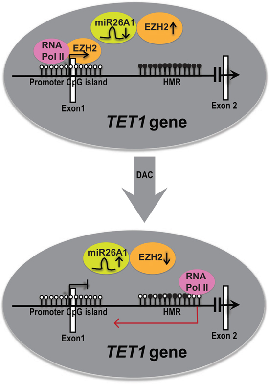 Finally, a schematic representation of overall data of this study is shown in Figure 6. TET1 is active and unmethylated at promoter region, but hypermethylated in the gene-body at intronic region (Figure 6, upper circle). Hypermethylation of HMR is required for the activation of the TET1 gene as we observe decrease in TET1 expression upon DAC (methyl inhibitor) treatment as shown in the Figure 6, lower circle. Loss of DNA methylation levels with DAC treatment resulted in the upregulation of miR26A1, decrease in EZH2 levels and induced expression of intronic transcripts at HMR region resulting in reduced RNA Pol II occupancy at the TET1 promoter, leading to reduced TET1 expression levels. Thus our data demonstrate a novel regulatory loop between miR26A1-EZH2 and TET1 and thus providing an explanation for consistent upregulation of TET1 and EZH2 in CLL patients while miR26A1 is hypermethylated. Hence, our study opens up a new avenue in the further exploration of regulatory connection of EZH2 and TET1.