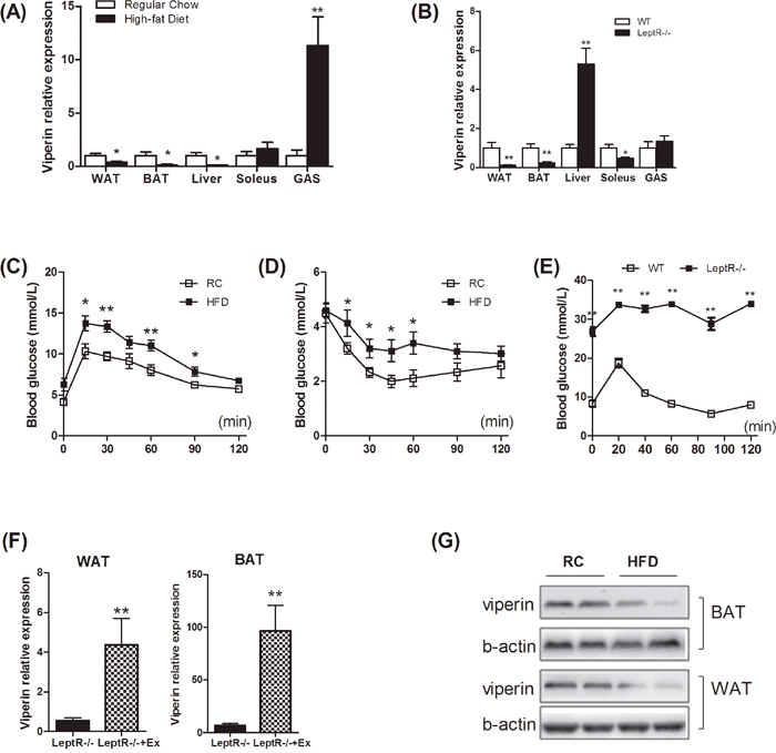 Figure 1: Insulin resistance reduced viperin expression in white and brown adipose tissues. Mice were fed HFD for 3 months to induce insulin resistance. LeptR-/- mice, leptin receptor- deficient db/db mice characterized initially by insulin resistance, were fed chow diet to determine viperin expression in different tissues. Relative mRNA expression of viperin was quantified in white adipose tissue (WAT), brown adipose tissue (BAT), liver, soleus and gastrocnemius (GAS) in HFD-fed mice (A) and LeptR-/- mice (B). Glycemic response to glucose tolerance test (C) and to insulin tolerance test (D) was examined in HFD-fed mice at the end of the study. (E) Glycemic response to glucose tolerance test was examined in LeptR-/- mice at the end of the study. Relative mRNA expression of viperin in WAT/BAT was investigated in LeptR-/- mice subjected to 6-wk swimming exercise (F), which was performed in a water tank for 60 min/day. Relative mRNA expression is normalized to GAPDH in liver and muscle and to 18S in adipose tissue by 2−ΔΔCt method. The data shown in Panels A–F are mean ± SE of 7–8 mice per group. *P<0.05, **P<0.01 versus control mice respectively. (G) Viperin expression in mice exposed to HFD was also investigated by western blot. Western blot shows that long-term exposure to HFD decreases the expression of viperin protein in WAT and BAT.