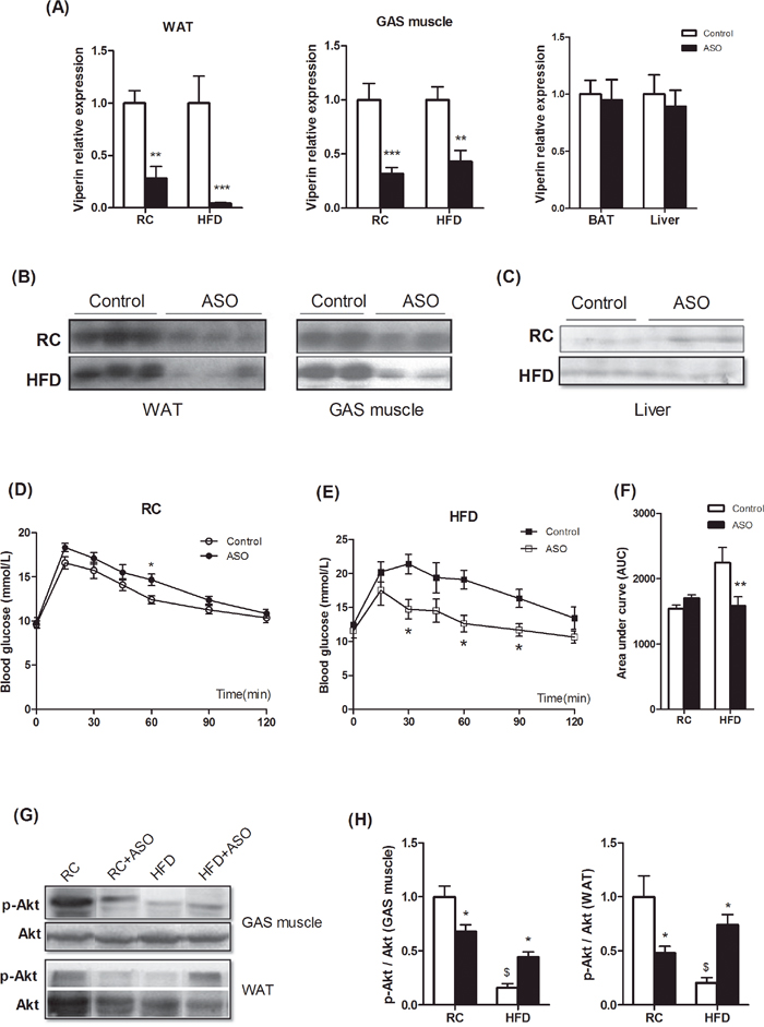 Figure 2: Viperin knockdown improved diet-induced glucose intolerance. Mice received i.p injections of ASO against Viperin or a scrambled control ASO twice a week for 4 wks. Meanwhile, mice were fed HFD for 4 wks. Viperin ASO decreased viperin mRNA expression in WAT and skeletal muscle, but not in BAT and liver (A). Values are normalized to 18S by 2−ΔΔCt method. The data shown are mean ± SE of 5-6 mice per group. **P<0.01, ***P<0.001 versus control mice respectively. Western blot shows that viperin ASO reduced viperin protein levels in WAT and skeletal muscle (B), but the protein level of viperin in liver is too low to detect (C). The data show that viperin ASO targeted WAT and skeletal muscle and silenced viperin expression. Panels D–F showed glycemic response to glucose tolerance test (IPGTT) in regular chow (RC)- and HFD-fed mice at the end of the study (D, E). Area under curve in Figure 2D-2E was shown to evaluate glucose intolerance (F). The data shown are mean ± SE of 5-6 mice per group. *P<0.05, **P<0.01 versus control mice respectively. (G) Phospho-Akt (Ser473) in WAT and GAS was investigated by western blot. Western blot shows that viperin ASO rescued HFD-induced inhibition of Akt phosphorylation. The blot shown is representative of 2 or 3 others showing the same pattern. (H) The quantitative analysis of western blot in Figure 2G. The data shown are mean ± SE of 3-4 mice. * P<0.05, versus control mice fed the same diet. $ P<0.05, versus control mice fed RC.