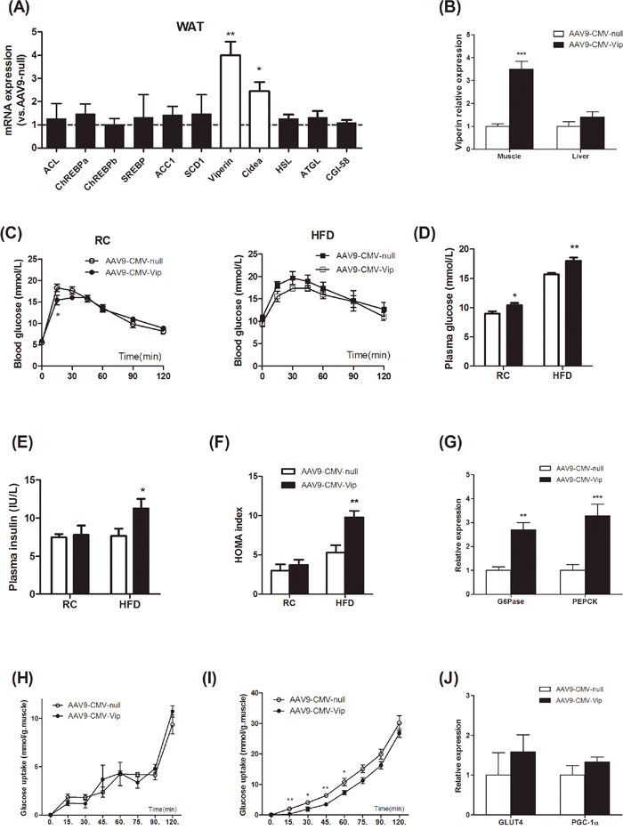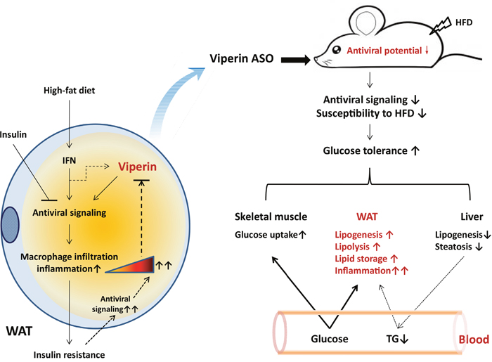 We evaluated the expression pattern of viperin in several tissues of insulin-resistant mice, which indicated that adipose tissues express the lower levels of viperin. However, specific knockdown of viperin with antisense oligonucleotides (ASO) in HFD-fed mice ameliorated glucose tolerance and enhanced adipose tissue inflammation. Viperin overexpression elevated fasting plasma glucose and inhibited adipocyte lipolysis. Silencing viperin induced reciprocal regulation of hepatic and adipose lipid metabolism under the challenge of high-fat diet. These findings suggest a previously unknown function for viperin in linking glucose metabolism to antiviral activity.
