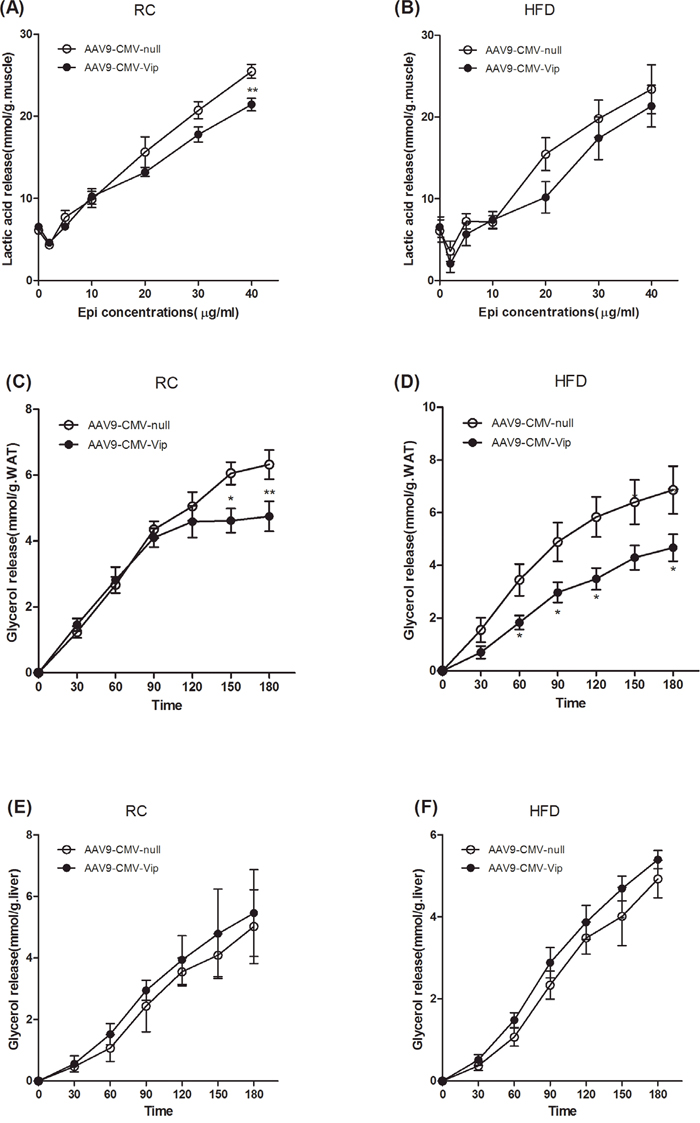 Intactgastrocnemius muscle and epididymal fat (WAT) from mice were preincubated for 2 h at 30°C in oxygenated (95% O2 and 5% CO2) Krebs-Ringer bicarbonate HEPES buffer (KRBH) containing (mM): 129 NaCl, 5 NaHCO3, 4.8 KCl, 1.2 KH2PO4, 1.2 MgSO4, 2.5 CaCl2, 2.8 glucose, 10 HEPES, and 0.1% BSA at pH 7.4. For ex vivo glucose uptake assay, intact muscles were incubated in culture medium with or without insulin (60 mU/mL) in an independent test for 15, 30, 45, 60, 75, 90, or 120 min. 2-deoxy-[3H]-glucose uptake was measured after incubation. For ex vivo analysis of epinephrine- stimulated lactic acid release, intact muscles were incubated for 15 min with epinephrine 2, 5, 10, 20, 30, or 40μg/mL, and then lactic acid content in culture medium was measured after incubation. For ex vivo analysis of epinephrine-stimulated glycerol release, WAT and liver were respectively incubated for 180 min with epinephrine. Glycerol contents in culture medium were measured per 30 min. Lactic acid and glycerol contents were measured using spectrophotometer following the manufacturers’ protocols (Nanjing Jianchen Biotech).