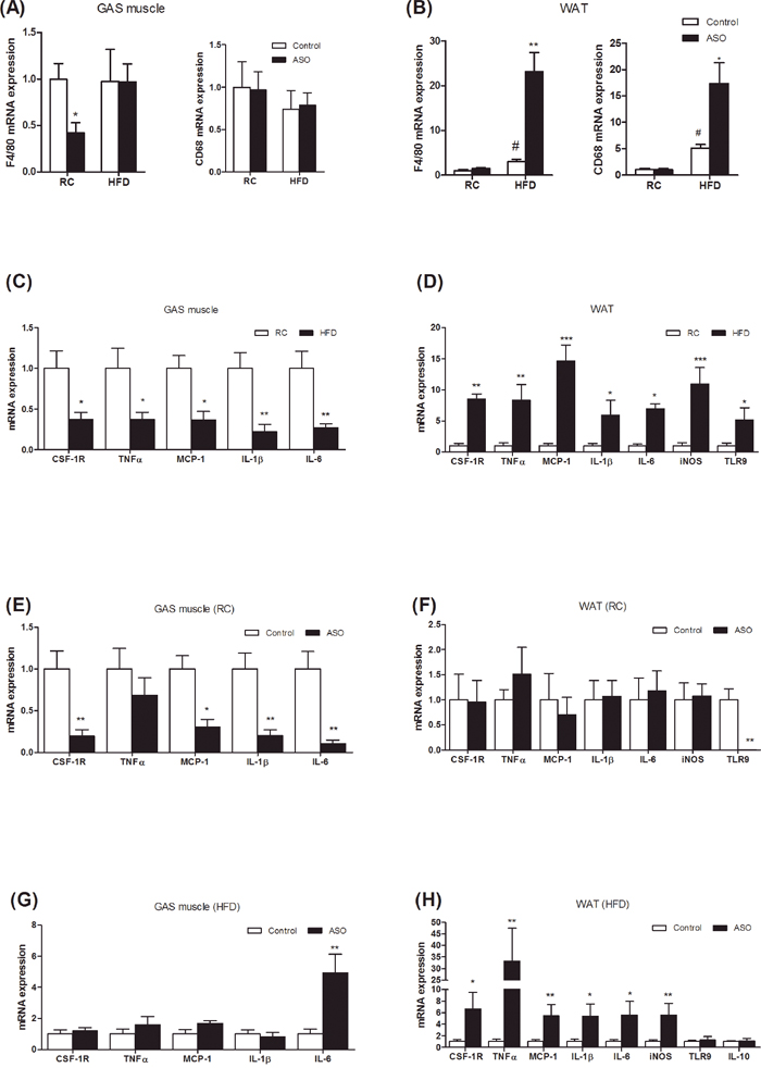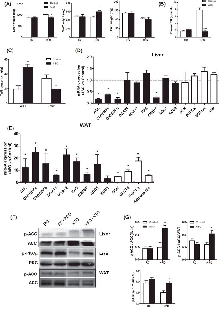 To determine the extent to which viperin controls glucose homeostasis in vivo, we treated regular chow(RC)- and HFD-fed mice with viperin ASO twice a week for 4 weeks. Antisense oligonucleotides (ASOs) are well designed to bind to the target RNA and reduce expression of the target gene primarily in liver and adipose tissue [19]. Here, treating mice with viperin ASO reduced viperin mRNA/protein expression by 70-90% in WAT and 50-60% in skeletal muscle (Figure 2A, 2B). However, viperin mRNA expression was not decreased in BAT and liver (Figure 2A). The protein level of viperin was too low to detect in liver (Figure 2C), so liver did not show a significant reduction in viperin expression. This prompted us conclude that viperin ASO reduced expression of the target gene by targeting WAT and skeletal muscle, rather than BAT and liver.