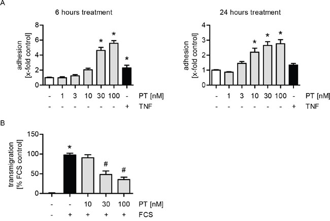 The adhesion of tumor cells onto the endothelium and their subsequent transendothelial migration represent two crucial steps in the metastatic process [17, 21]. We analyzed the influence of PT on HUVECs in in vitro cell adhesion and transmigration assays with MDA-MB-231 tumor cells. Of note, only the endothelial cells were treated with PT. We could show that treatment with PT for 6 or 24 h increases the adhesion of tumor cells onto the endothelial monolayer in a concentration-dependent manner (Figure 1A). TNFα, which is known to activate endothelial cells [22, 23], was used as a control. Interestingly, the transmigration of MDA-MB-231 cells trough the HUVEC monolayer was strongly reduced upon PT treatment in a concentration-dependent manner (Figure 1B).