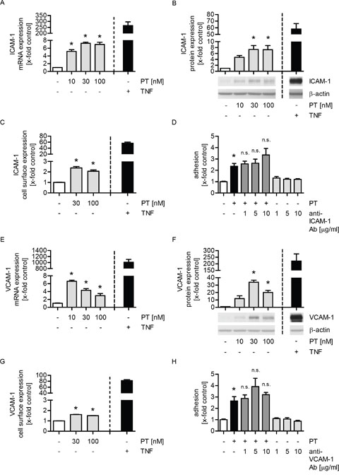 Figure 2: The enhanced expression of ICAM-1 or VCAM-1 is not responsible for the PT-triggered tumor cell adhesion. (A/E) Confluent HUVECs were treated with PT (10, 30, 100 nM) or TNFα (10 ng/ml) for 12 h. The mRNA expression of ICAM-1 (A) or VCAM-1 (E) was analyzed by qPCR experiments. (B/F) Confluent HUVECs were treated with PT (10, 30, 100 nM) or TNFα (10 ng/ml) for 24 h. The total protein expression of ICAM-1 (B) or VCAM-1 (F) was determined by western blot analysis. (C/G) Confluent HUVECs were treated with PT (30, 100 nM) or TNFα (10 ng/ml) for 24 h. The cell surface expression of ICAM-1 (C) or VCAM-1 (G) was analyzed by flow cytometry. (D/H) Confluent HUVECs were treated with 30 nM PT for 24 h. An ICAM-1 blocking antibody (1, 5, 10 μg/ml) (D) or a VCAM-1 blocking antibody (1, 5, 10 μg/ml) (H) was added for the last 30 min of PT treatment. Fluorescence-labeled MDA cells were added and were allowed to adhere for 10 min. The amount of adherent MDA cells was determined by fluorescence measurements. (A-H) Data are expressed as mean ± SEM. A-C and E-H: n=3, D: n=5. *p ≤ 0.05 versus negative control, n.s.: p > 0.05 versus PT alone. TNFα was used as positive control and was not included into the statistical analyses.
