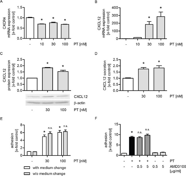 Figure 3: The increased expression of CXCL12 is not linked to the PT-evoked tumor cell adhesion. (A/B) Confluent HUVECs were treated with PT (10, 30, 100 nM) for 12 h. The mRNA expression of CXCR4 (A) and CXCL12 (B) were analyzed by qPCR experiments. (C/D) Confluent HUVECs were treated with PT (30, 100 nM) for 24 h. (C) The total protein expression of CXCL12 was determined by western blot analysis. (D) CXCL12 levels in the cell supernatant were investigated by ELISA. (E) Confluent HUVECs were treated with PT (30, 100 nM) for 6 h. After treatment, the cell culture medium was removed and replaced by fresh medium (indicated as “with medium change”) or not (indicated as “w/o medium change”). (F) Confluent HUVECs were pretreated with the CXCR4 antagonist AMD3100 (0.5, 5 μg/ml) for 30 min. Then, PT (30 nM) was added for 24 h. (E/F) Fluorescence-labeled MDA cells were added and were allowed to adhere for 10 min. The amount of adherent MDA cells was determined by fluorescence measurements. (A-F) Data are expressed as mean ± SEM. A-D: n=3, E: n=5, F: n=4. *p ≤ 0.05 versus negative control, n.s.: p > 0.05 versus “with medium change” (E) or PT alone (F).