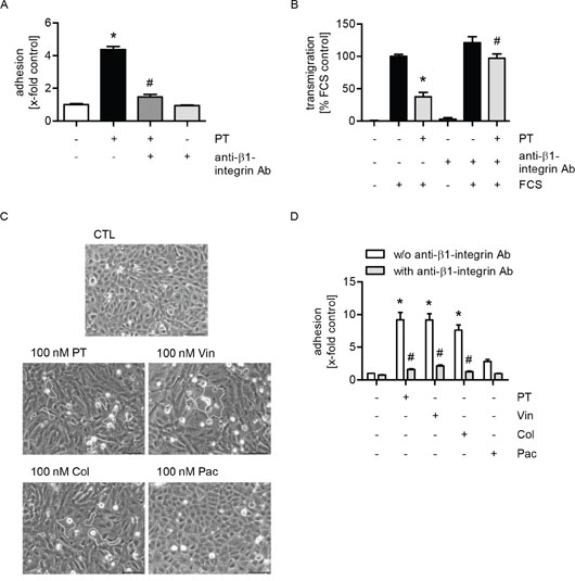 The influence of MTAs on endothelial cells is well studied regarding their anti-angiogenic and vascular-disrupting effects on the tumor microvasculature [28–31]. However, the impact of MTAs on endothelial cells of the non-tumor vasculature has been largely neglected. These cells play an essential role in metastasis, since they regulate the intra- and extravasation of hematogenically disseminated tumor cells [21, 32, 33]. In the present study, we analyzed the influence of PT on the interaction of non-tumor endothelial cells and breast cancer cells in vitro, since we hypothesized that PT influences the metastatic process – at least in part – via a direct action on the endothelium. We showed that the treatment of endothelial cells with PT strongly increased the adhesion of breast cancer cells to interendothelial gaps, but reduces their transmigration through the endothelial monolayer.