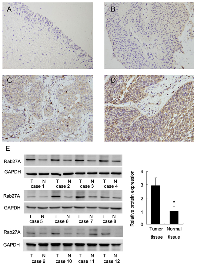 Figure 1: Expression pattern of Rab27A in bladder cancer tissues. (A) Negative Rab27A staining in the majority of normal bladder epithelial tissues. (B) Negative Rab27A staining in a case of non-muscle invasive bladder cancer tissue. (C) Weak cytoplasmid Rab27A staining in a case of muscle invasive bladder cancer. (D) Strong cytoplasmic/nuclear staining of Rab27A in a case of muscle invasive bladder cancer. (Magnification, 400X). (E) Rab27A protein expression was examined in 8 paired tumor (T)/adjacent normal (N) tissues. Western blot revealed that Rab27A overexpression was obvious in 7/12 of these paired tissues. Relative staining intensity was quantified by ImageJ software. The average western blot intensity was higher in cancer tumor tissues compared with that in normal tissues. * p<0.05.