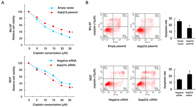Figure 4: Rab27A confers cisplatin resistance in bladder cancer cells (A) CCK8 showed that RAB27A overexpression upregulated cell viability in BIU-87 cells with cisplatin treatment at different concentration. RAB27A siRNA showed the opposite effect by downregulating 5637 cell viability (B) Annexin V/PI staining showed that Rab27A plasmid significant downregulated apoptosis rate in BIU-87 cells treated with 10μM cisplatin, while Rab27A siRNA facilitated cisplatin induced apoptosis in 5637 cells. * p<0.05.