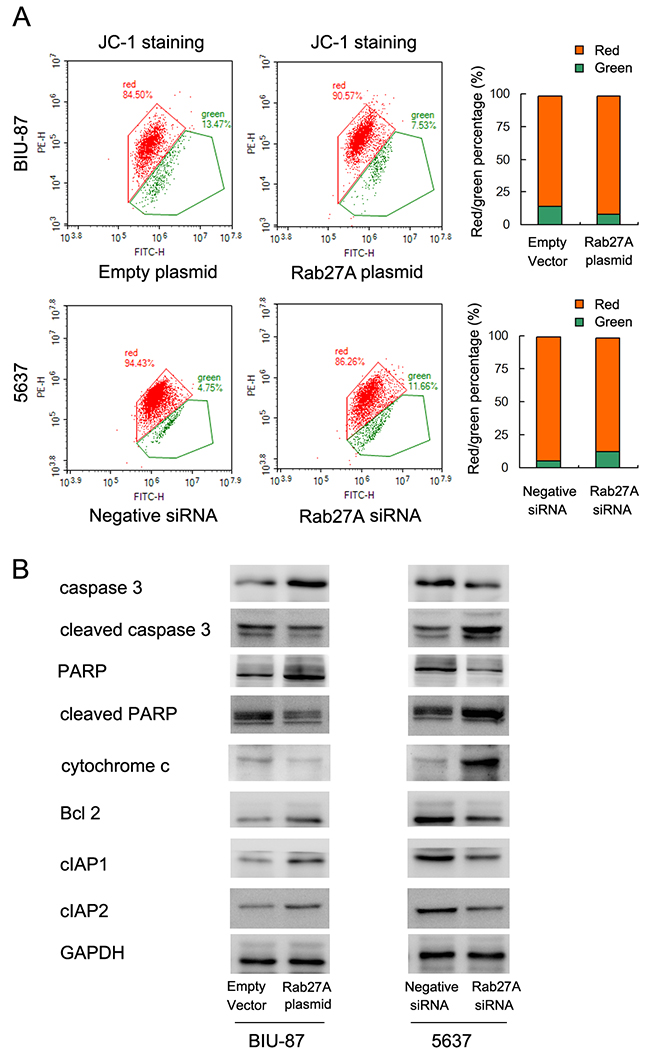 Figure 5: Rab27A regulates mitochondrial membrane potential and apoptosis related proteins. (A) JC-1 staining and flow cytometry demonstrated that after Rab27A plasmid treatment, the JC-1 red/green ratio increased, indicating upregulated mitochondrial membrane potential. (B) Western blot showed that Rab27A overexpression downregulated expression of cytochrome c, cleaved caspase 3 and cleaved PARP while upregulated Bcl-2, cIAP1 and cIAP2 protein. Rab27A siRNA upregulated cytochrome c, cleaved caspase 3 and cleaved PARP while downregulated Bcl-2, cIAP1 and cIAP2 protein.