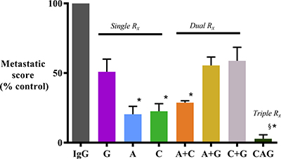 Figure 2: Effect of treatments on metastatic spread. Mice treated with AMG102 and Compound-A (both as single agents and in combination) exhibited significantly reduced metastatic spread to the organs/regions depicted in the Table 1 when compared to IgG treated mice. In contrast, decrease in metastasis was not statistically significant in mice treated with gemcitabine as single agent or in dual combinations. Interestingly, mice treated with triple therapy exhibited virtual absence of metastasis. (*p < 0.05; §p < 0.001 vs IgG, n = 7/group). Study Groups: Control group (IgG/vehicle control). AMG102 - A, Compound-A (small molecule c-MET inhibitor)- C, Gemcitabine - G, AMG102 + Compound-A (A+C), AMG102 + gemcitabine (A+G), c-MET inhibitor + gemcitabine (C+G), AMG102 + c-MET inhibitor + gemcitabine (Triple therapy or CAG)