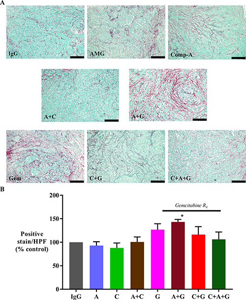 Figure 4: Effect of treatments on collagen deposition. (A) Representative images of tumor sections stained for Sirius red (marker for collagen deposition) (scale bar: 200 μm). (B) A bar graph depicting the morphometric analysis for collagen deposition in our orthotopic model. Fibrillar collagen deposition was increased in animals treated with gemcitabine + AMG102 when compared to any other treatment (*p < 0.05 vs IgG, AMG102 and compound-A). Study Groups: Control group (IgG/vehicle control). AMG102 - A, Compound-A (small molecule c-MET inhibitor)- C, Gemcitabine - G, AMG102 + Compound-A (A+C), AMG102 + gemcitabine (A+G), c-MET inhibitor + gemcitabine (C+G), AMG102 + c-MET inhibitor + gemcitabine (Triple therapy or CAG)