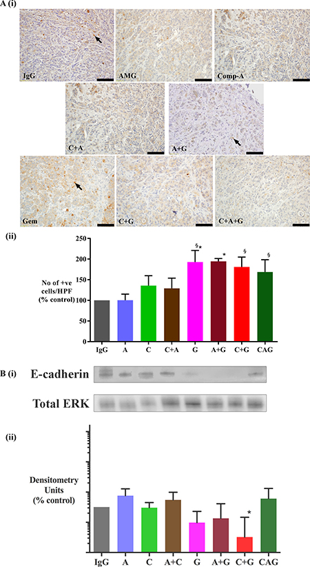 Figure 6: Effect of treatments on epithelial-mesenchymal transition (EMT). (A) Effect of treatments on TWIST (EMT marker) expression (i) Representative images of tumor sections immunostained for the EMT marker TWIST. Arrows indicate representative positive cells. (scale bar: 100 μm). (ii) Graph depicting morphometric analysis for TWIST positive cells (EMT marker) [number of brown positive cells per unit area of tumor, and expressed as % of control (IgG treated tumors)]. Compared to IgG treated tumors, the number of cells undergoing EMT was significantly increased by gemcitabine treatment both as a single agent (G) and in combination with AMG102 (A+G). Gemcitabine alone and in combination with compound-A as well as in triple therapy increased EMT when compared to AMG102 treated tumors (*p < 0.05 vs IgG, §p < 0.05 vs AMG102, n = 7 mice/group). (B) Effect of treatments on E-cadherin (EMT marker) expression. (i) Representative immunoblots for e-cadherin (top panel) in tumor homogenates from the orthotopic model. The bottom panel shows immunoblots for total ERK, used as a loading control. (ii) Bar graphs showing densitometry results [corrected for respective loading controls and expressed as % of control in log10 scale (IgG treated tumors)]. Compared to control tumors, expression of e-cadherin is significantly reduced in mice treated with C+G. However this reduction is not seen in tumors from mice that received triple therapy (*§p < 0.05 vs A, A+C, CAG, n = 7 mice/ treatment group).Study Groups: Control group (IgG/vehicle control). AMG102 - A, Compound-A (small molecule c-MET inhibitor)- C, Gemcitabine - G, AMG102 + Compound-A (A+C), AMG102 + gemcitabine (A+G), c-MET inhibitor + gemcitabine (C+G), AMG102 + c-MET inhibitor + gemcitabine (Triple therapy or CAG).
