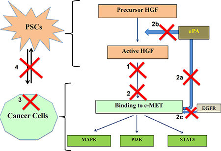 1) HGF inhibition neutralises PSC-derived active HGF in the ECM surrounding cancer cells, thus preventing HGF/c-MET binding. 2) c-MET inhibition blocks ligand-receptor binding leading to. a) inhibition of downstream intracellular signalling cascades. b) reduction of uPA production by cancer cells, thus preventing further HGF activation (thus inhibiting the positive feedback loop).c) blockade of stemness in cancer cells (given that c-MET is recognized to be a stem cell marker in pancreatic cancer [30, 43]). d) blockade of the transactivation of the c-MET receptor that is known to occur via other pathways such as the epidermal growth factor receptor (EGFR) [44].