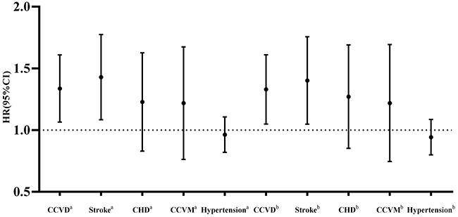 Figure 1: The HRs (95% CIs) of the additive model of rs1874479 for the risk of CCVD incidence, stroke, CHD, CCVM and hypertension in the follow-up study. a Crude HRs (95% CIs); b HRs (95% CIs) with adjustments for age, gender, TC, TG, LDL-C, HDL-C, diabetes, BMI, smoking status, drinking status and hypertension (except for the incident hypertension).