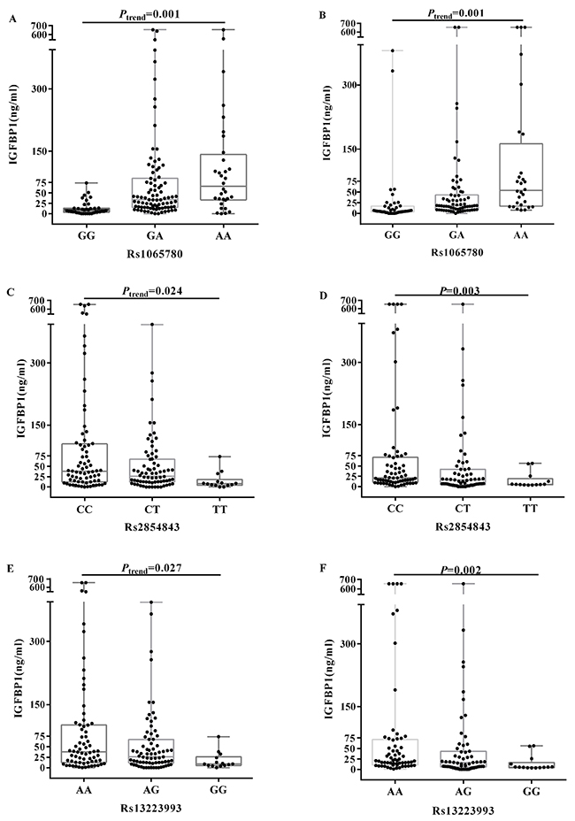 Figure 2: Serum IGFBP1 levels were compared among the genotypes of rs1065780, rs2854843 and rs13223993 in the controls and hypertension cases. IGFBP1 levels are plotted around the median as box plots, and the dots represent individual data points. The diamonds and the whiskers represent the mean and SD of the IGFBP1 levels, respectively. Figure 2 (A), (C) and (E) show the IGFBP1 levels among the genotypes in the controls, and (B), (D) and (F) display the IGFBP1 levels among genotypes in the hypertension cases. The serum IGFBP1 levels linearly increased with the variations in rs1065780 both in the controls and the hypertension cases (Ptrend=0.001). They linearly decreased with variations of in rs2854843 and rs13223993 in the controls (Ptrend <0.05). rs2854843 and rs13223993 variations were associated with lower IGFBP1 levels in the hypertension cases (all P <0.05).