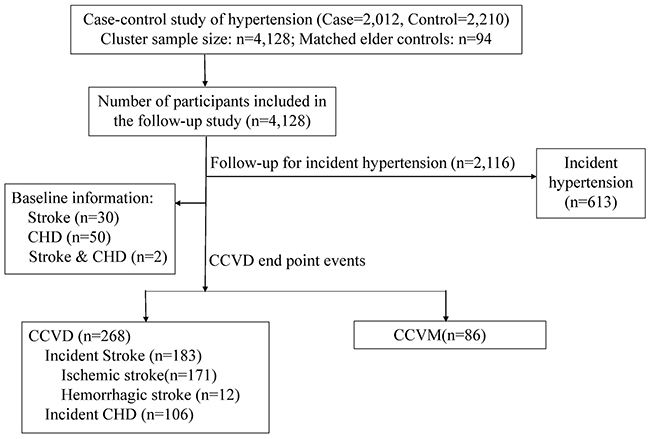 In the follow-up study, 94 elderly matched controls for the case-control study were excluded. A total of 4128 subjects participated in the follow-up study, and a total of 2116 healthy controls were included. Participants were prospectively followed during a median follow-up period of 5.01 years to assess the incidence of hypertension, CCVD and CCVD mortality (CCVM) events, including stroke and CHD (Figure 3).