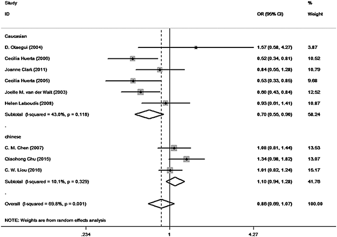 The results of our meta-analysis are summarized in Table 3. According to the I-squared value, heterogeneity was present in the allele model (I² = 69.8%, P = 0.001), so the random effect model was selected. We also performed subgroup analysis stratified by ethnicity (in the Caucasian population: I² = 43.0%, P = 0.118; in the Asian population: I² = 10.0%, P = 0.329). According to our results, although no significant association between mtDNA A10398G polymorphism and PD was found when polling all populations overall(G vs. A: OR = 0.858, 95% CI = 0.686–1.074, P = 0.181) or in the Asian population (G vs. A: OR = 1.090, 95% CI = 0.939–1.284, P = 0.242), in the Caucasian population (G vs. A: OR = 0.699, 95% CI = 0.546–0.895, P = 0.005) the G allele of mtDNA A10398G mutations may be a potential protective factor of PD. The forest plot of mtDNA A10398G polymorphism in PD is shown in Figure 2.
