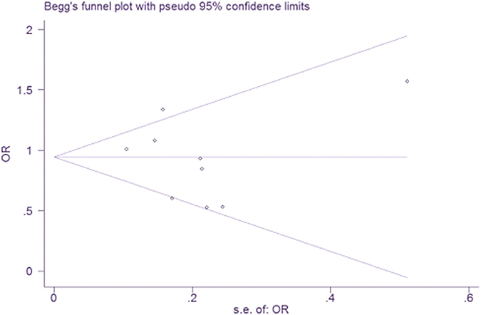 Figure 3: Begg’s funnel plot for publication bias analysis for mtDNA A10398G polymorphisms.