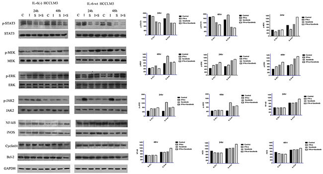 Figure 6: IL-6 on signaling transduction pathways including p-MEK/p-ERK, p-JAK2/p-STAT3, and NF-kB-iNOS. Three major signaling transduction pathways, including p-MEK/p-ERK, p-JAK2/p-STAT3, and NF-kB-iNOS were tested to explore the downstream modulation of IL-6. IL-6 could down-regulate the protein expression of p-STAT3 in a time-dependent manner, However, IL-6 has no effect on p-JAK2 expression. IL-6 has a promotion effect on the expression of p-MEK/p-ERK and NF-kB/iNOS. Furthermore, other proliferation- and apoptosis-related protein, such as cyclin-D1 and Bcl-2, were not affected by the IL-6. We found that the p-STAT3 expression was similarly reduced by the sorafenib in both cell lines in 24 hr and significantly reduced in 48 hr in HCCLM3-wt cells. p-JAK2, p-MEK and p-ERK were inversely up-regulated by sorafenib in a time-dependent manner. IFN-α had the opposite promotion effect on p-JAK2/p-STAT3 and p-MEK/p-ERK. The effect of co-treatment on these three major signaling transduction pathways is similar as the sorafenib group in terms of p-JAK2/p-STAT3 and p-MEK/p-ERK. In terms of NF-kB/iNOS, either IFN-α or sorafenib has no significant effect on the cell signal pathways. However, both statistically increased in the combination group in HCCLM3-wt cells in 48 hr.
