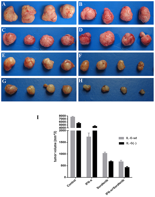 Figure 7: IL-6 on tumor growth and treatment in vivo. IL-6 significantly promote tumor growth in vivo study for six wk as compared with HCC with HCCLM3-IL6(-) cells. Sorafenib has predominant inhibition on tumor growth when IL-6 was knocked out, whereas IFN-α treatment significantly inhibited tumor growth in the HCC derived from HCCLM3-wt cells. The combination of sorafenib and IFN-α treatment showed the highest predominant inhibition on tumor derived from HCCLM3-IL6(-) cells. (A) Control group (HCCLM3-wt); (B) control group (HCCLM3-IL-6(-)); (C) IFN-α treatment group (HCCLM3-wt); (D) IFN-α treatment group (HCCLM3-IL-6(-)); (E) sorafenib treatment group (HCCLM3-wt); (F) sorafenib treatment group (HCCLM3-IL-6(-)); (G) combination treatment group (HCCLM3-wt); (H) combination treatment group (HCCLM3-IL-6(-)).