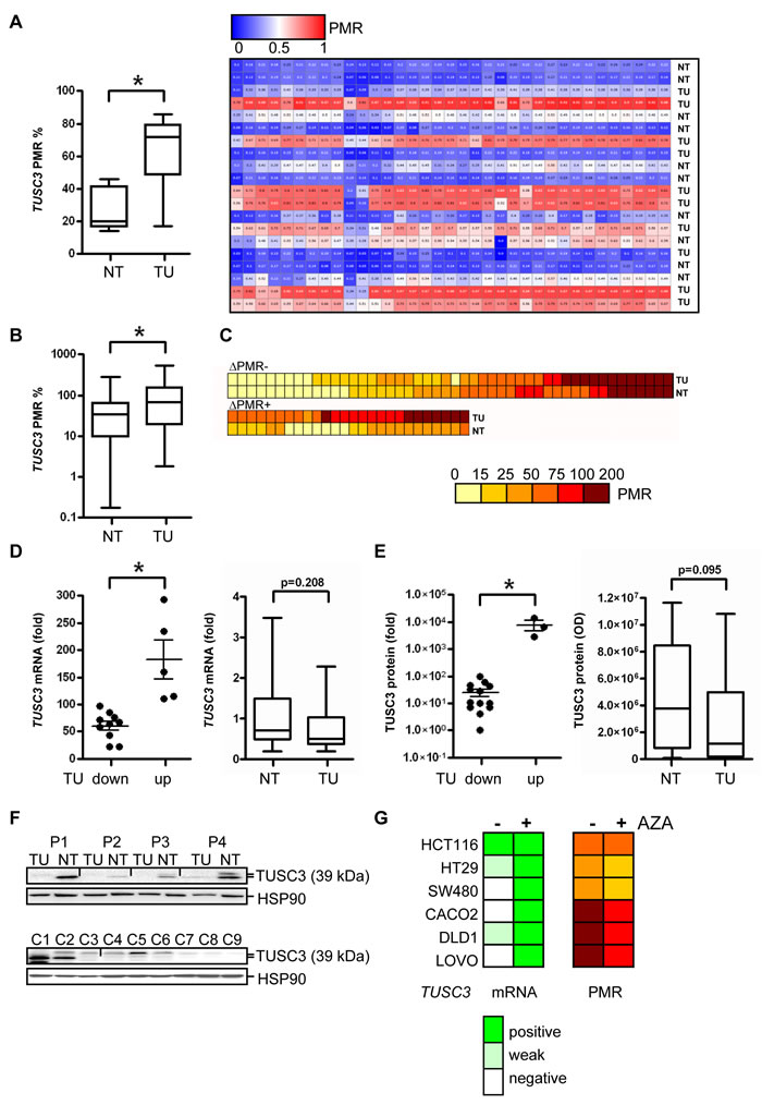 Figure 1: TUSC3 is down-regulated in a large subgroup of CRC patients by epigenetic silencing. A., Validation of TUSC3 promoter methylation in human CRC by next generation sequencing (NGS). DNA was extracted from CRC patients, bisulfite converted and sequenced comparing matched TU and NT tissue. Left panel: quantitative comparison of PMR values from TU vs. NT samples (*p = 0.0016; paired t-test, n = 10 cases), right panel: individual cases. B.-C., Detection of TUSC3 promoter methylation in human CRC by ML-PCR. DNA was extracted from CRC patients from TU and NT tissue. PCRs were performed, and the PMR values calculated and presented as color code. Comparison of TU and NT samples (*p < 0.0001, Wilcoxon signed rank test, n = 74 cases, B); detection of TUSC3 methylation in both TU and NT samples (upper panel, C); differential TUSC3 methylation in a subgroup of TU and NT samples (lower panel, C). D., TUSC3 mRNA expression is down-regulated in CRC. Total RNA was extracted, and CT-values were normalized to beta2-microglobulin (B2M) and calculated as -fold ± S.E. of TU compared to NT (mean of 4 healthy individuals) tissue (*p = 0.0007, Mann Whitney test, n = 15 cases, left panel). E., Quantitative analyses of Western blots detecting endogenous TUSC3 protein in total tissue lysates from frozen TU and NT samples of CRC patients. O.D. values from bands in gels were normalized to HSP90 as a loading control and calculated as -fold ± S.E. (*p = 0.0098, Mann Whitney test, n = 17 cases, left panel). F., Representative Western blots from total cell and tissue lysates are shown which detect a major band at 39 kDa for TUSC3 protein. Top panel: TU and matched NT samples from the same patients (P1-P4) were analyzed. Bottom panel: C1 = HEK293T cells transfected with TUSC3 plasmid, C2 = HEK293T transfected with FLAG-TUSC3 plasmid, C3 = HEK293T transfected with EV plasmid, C4 = SW480, C5 = HCT116, C6 = HT29, C7 = CACO2, C8 = LOVO, C9 = DLD1. G., Detection of TUSC3 promoter methylation (right panel) and mRNA expression (left panel) in human CRC cell lines by ML-PCR and RT-qPCR, respectively. After incubation of cells with and without the demethylation agent AZA (at 10 µM) for 3 days, DNA and total RNA were extracted. Color codes represent PMR for DNA methylation and scores for mRNA expression.
