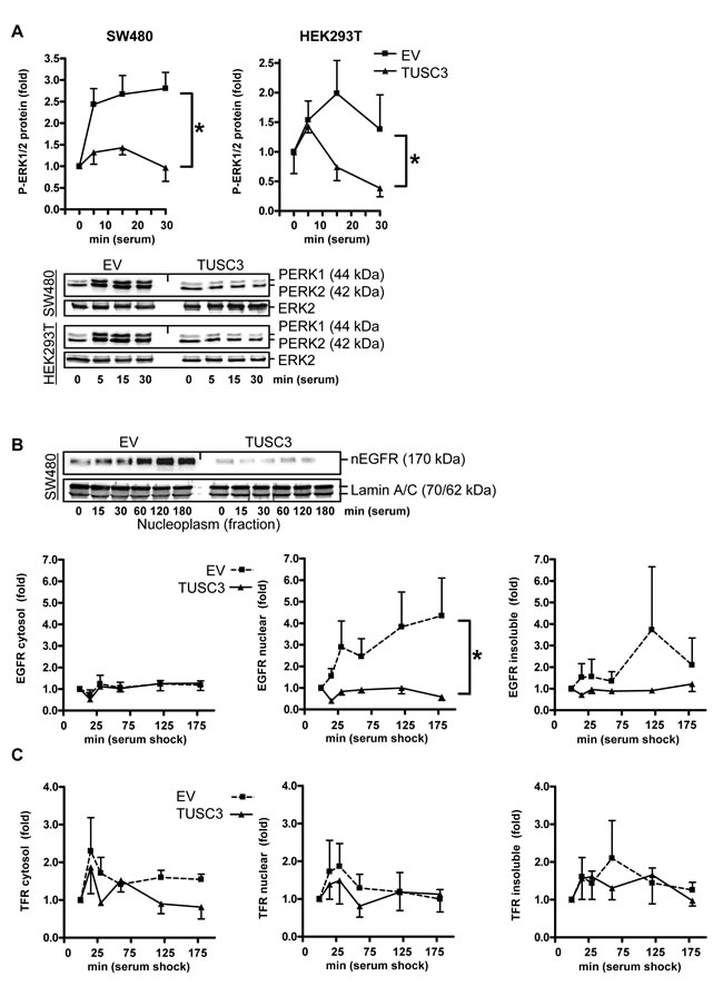 Figure 3: TUSC3 inhibits EGFR down-stream signaling and compartmentalization. A., TUSC3 reduces phosphorylation of ERK1/2. SW480 and HEK293T cells were transfected with TUSC3 or EV plasmids, starved and stimulated as described in Figure 2B. Quantitation and representative Western blots are shown. O.D. values from bands in gels were calculated as -fold ± S.E. (*p < 0.05 TUSC3 vs. EV, Two-way ANOVA, n = 3). B.-C., TUSC3 reduces nuclear accumulation of the EGFR (B) but not of the control transferrin receptor (TFR/CD71) (C). SW480 cells were transfected with TUSC3 and EV plasmids for 24 h, followed by serum removal for 16 h and restimulation with 20 % FCS for 0 to 3 h before cell harvest to evoke endocytosis of the EGFR. Cells were then subjected to SCF, and Western blots were done with an Ab against the C-terminal cytoplasmic (intracellular) domain of the EGFR and quantified as in A (*p < 0.05 TUSC3 vs. EV, Two-way ANOVA, n = 3). Representative Western blots are shown above the bar graphs.