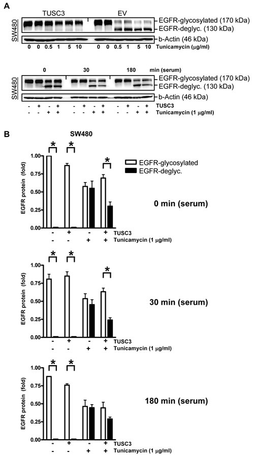 Figure 4: TUSC3 prevents tunicamycin-dependent EGFR deglycosylation. A., TUSC3 protects N-glycosylated EGFR in presence of the glycosylation inhibitor tunicamycin. Upper panel: SW480 cells were transfected with TUSC3 and EV plasmids for 6 h, followed by an incubation in presence or absence of tunicamycin (µg/ml) for additional 18 h. Lower panel: SW480 cells were transfected as above, followed by serum removal for 16 h in presence and absence of tunicamycin (1 µg/ml) and restimulation with serum (20 % FCS) for 0, 30 min to 3 h. TCLs were extracted for Western blotting using the C-terminal EGFR Ab. Representative gels from concentration- and time-dependent responses are shown. B., Quantitative analyses of Western blots in A. The O.D. values from bands in gels are calculated as -fold ± S.E. (*p < 0.05 EGFRp170 vs. EGFRp130, Two-way ANOVA, n = 3).