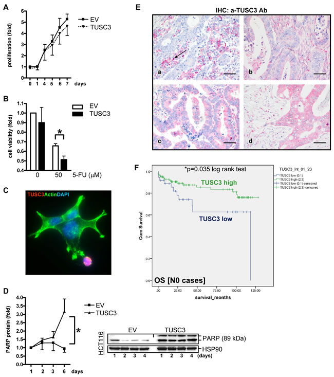 Figure 5: TUSC3 enhances CRC cell death and is associated with prognosis of CRC patients. A., Growth kinetics. SW480 cells were transfected with TUSC3 or EV plasmid, and proliferation was measured by colorimetric MTT assay after 1 to 7 days. O.D. values were calculated as -fold ± S.E. compared with day 0 (n.s., Two-way ANOVA, n = 3). B., Chemoresistance response. SW480 were transfected for 24 h as in A, followed by an incubation with 5-FU (at 50 µM), and cell viability was determined after 48 h. Data were calculated as in A compared with vehicle control (*p < 0.05 EV vs. TUSC3, Two-way ANOVA, n = 3). C.-D., TUSC3 promotes cell death (apoptosis). SW480 cells were transfected with TUSC3 or EV and incubated for 1 to 6 days. Color code: red = FLAG-TUSC3; green = actin (phalloidin); blue = nuclei (DAPI); magnification x630. Note the spread-out morphology of live TUSC3-negative cells in green vs. round dying TUSC3-positive cells in red. Representative immunofluorescence images (C) and quantitative Western blot analyses (D) from TCL (all 3 cell lines) are shown which detect cleaved PARP (apoptosis marker). Data are -fold ± S.E (*p < 0.05 EV vs. TUSC3, Two-way ANOVA, n = 3). E., TUSC3 is lost in a subset of CRCs. Tissue microarrays (TMAs) with tumor specimens from CRC patients (n = 306) were stained by immunohistochemistry (IHC). Representative images: (a) TUSC3 negative tumor cells [score 0] with black arrow marking TUSC3+ blood-derived plasma cells (positive control); (b-d) TUSC3+ tumor cells [(b) score 1, (c) score 2, (d) score 3] and stroma. F., Kaplan-Meier-Survival-Analysis. TUSC3 protein expression and its correlation to prognosis (Supplementary Table S1-S3) and clinical factors (Table S4) was calculated. Combined scores for the intensity and frequency of TUSC3 staining in tumor and stroma tissue are expressed as: 0 = negative (0-25 %), 1+ = weak positive (25-50%), 2+ = moderate positive (50-75 %), 3+ = strong positive (75-100 %). Node negative (N0) patients with low (scores 0-1) TUSC3 expression have a reduced overall survival (OS) probability compared with patients showing high (scores 2-3) TUSC3 expression (n = 135, *p = 0.035, log rank test).
