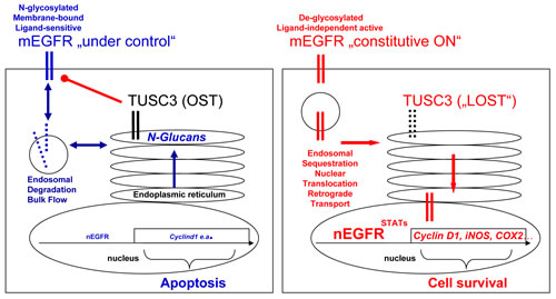 From the existing literature, it is yet unclear whether N-glycosylation renders the EGFR more or less active [22]. Since we show that TUSC3 inhibits EGFR signaling, our work may contribute to answer this question. Taken together, we propose the following model (Figure 6): in non-malignant cells, TUSC3 is a part of the OST multiprotein complex in the ER which promotes N-glycosylation of EGFR, one out of many exemplary targets, and facilitates its processing, folding, transport and insertion [22] into the plasma membrane [7, 23] where it is ready for ligand binding, dimerization and signal initiation. N-glycosylation is also a determinant for timely plasma membrane retention of the EGFR, which enables internalization (endocytosis), endo-lysosomal sorting and degradation of the receptor in order to limit and terminate signaling [16, 24]. Upon silencing of TUSC3 in cancer cells, this fine-tuned regulation at the plasma membrane is impaired. Altered retention times and spatial sequestration of EGFR from its extracellular ligands or intracellular recycling and degradation routes may facilitate constitutive EGFR signaling. Moreover, nuclear EGFR may act independently of ligand to activate transcription of proto-oncogenes. Further studies have to explore the spatial compartmentalization of EGFR and other growth factor receptors to elucidate the role of these mechanisms for resistance to EGFR-targeted therapies.