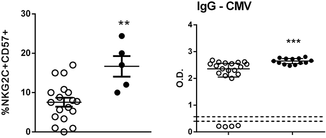 Figure 2: Determination of CD57+NKG2C+ NK cells. Percentage of CD57+NKG2C+ in NK cells from peripheral blood of HC (n=18, open circle) and SS (n=5, closed circle) patients was assessed by flow cytometry. Serology for HCMV in serum from HC (n=21) and SS (n=13) groups was performed by ELISA. The results are shown as mean with SEM. **p≤0.01, ***p≤0.001 compared with the HC group.