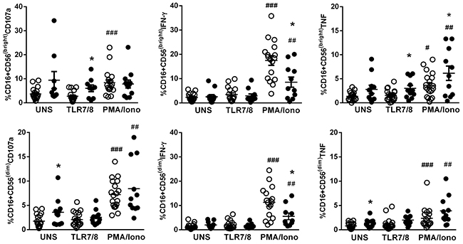 Figure 3: Effector molecules produced by NK cells after stimulation with a TLR7/8 agonist in SS patients. CD56bright and CD56dim NK subsets from SS patients (n=11, closed circle) and healthy controls (HC, n=20, open circle) were assessed by flow cytometry for CD107a, IFN-γ, and TNF expression after stimulation with a TLR7/8 agonist (CL097) and PMA plus ionomycin. The results are shown as mean with SEM. *p≤0.05, **p≤0.01 compared with the HC group; #p≤0.05, ##p≤0.01, ###p≤0.001 compared with the unstimulated condition.