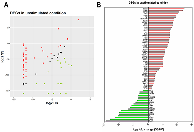 Figure 4: Abundance of differentially expressed genes (DEGs) of the TLR signaling pathway in NK cells from SS patients. Freshly isolated NK cells were assessed in the unstimulated condition by PCR array for 84 genes using a human TLR signaling pathway kit. (A) Scatter plot of the normalized expression of DEGs (expressed as log2 of median values) in NK cells from SS patients compared to HC; genes were classified as increased (red), unchanged (black) or reduced expression (green). (B) Identity and fold change (SS in relation to HC, expressed as log2-fold change of median value) of individual DEGs. Data are representative of one experiment with three SS patients (SS19, SS2, and SS20) and three HC individuals (HC 1-3).