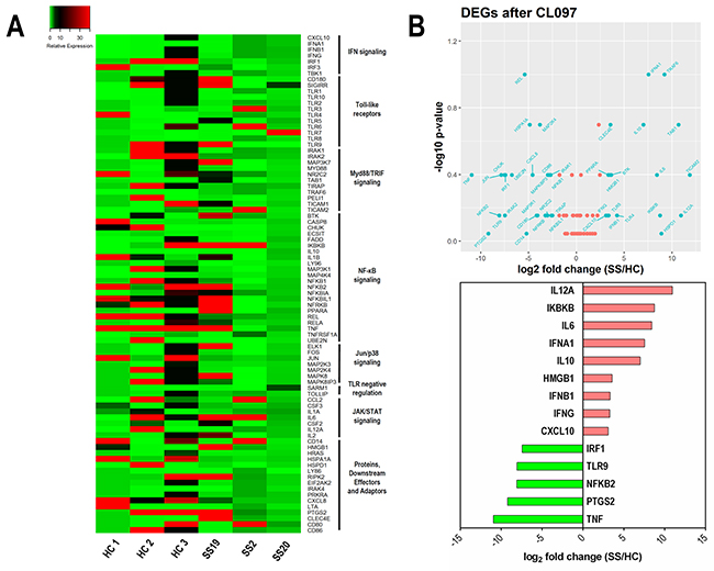 Figure 5A shows a heat map of the TLR signaling pathway genes after TLR7/8 stimulation in NK cells from SS and HC subjects. Again, a different profile of genes was detected in stimulated NK cells from SS patients, as shown by the volcano plot (Figure 5B), in which 28 genes were up-regulated in SS patients, 29 were down-regulated and 27 genes have similar expressions in both groups. Due to the clinical heterogeneity in SS patients, no statistical significance was detected in our analysis; however, the analyzed patients showed consistent expression profiles. Figure 5B shows some selected DEGs upon stimulation of TLR7/8. Notably, some genes that were repressed under normal circumstances in SS patients, especially those associated with IFN signaling, were up-regulated following CL097 stimulation, such as the cytokines IL-12A, IFNA1, IFNB1, IFN-γ and the IFN-γ-inducible chemokine CXCL10. In addition, the induction of IKBKB, which degrades the NFκB inhibitor IκB, may contribute to the activation of the NFκB pathway. In parallel, TLR7/8 stimulation also induced regulatory genes, such as IL-10, and anti-tumor factors, such as high-mobility group box 1 protein (HMGB1) [42].
