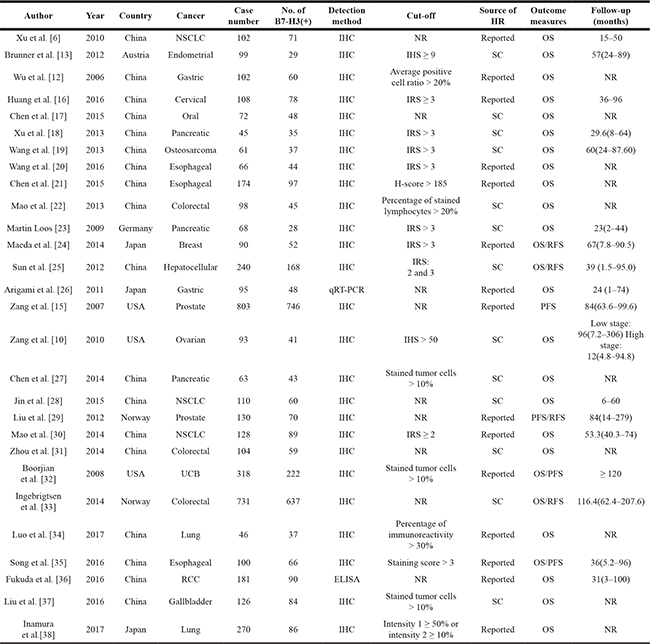 OS: overall survival; PFS: progression-free survival; RFS: recurrence-free survival; HR: hazard ratio; CI: confidence interval; NSCLC: non-small-cell lung cancer; UCB: urothelial carcinoma of the bladder; RCC: renal cell carcinoma; IHC: immunohistochemistry; IRS: immunoreactivity score; IHS: immunohistochemical score; qRT-PCR: quantitative real-time fluorescence polymerase chain reaction; ELISA: enzyme-linked immunosorbent assay; NR: no report; SC: survival curve; PD: P value for subgroup difference; NOS: Newcastle-Ottawa Quality Assessment Scale.