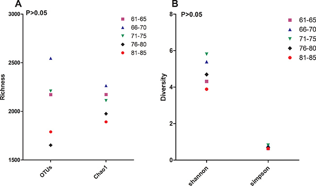 The levels of OTUs and Chao1 were slightly decreased in the elderly compared to non-elderly, while the values of the Shannon and Simpson index were slightly higher in the elderly, though no significant differences were detected (Table 2).