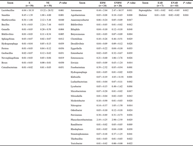 Table 2: Comparison of richness and diversity estimators between the E and NE cohort, EDM and ENDM group, EAB and ENAB group