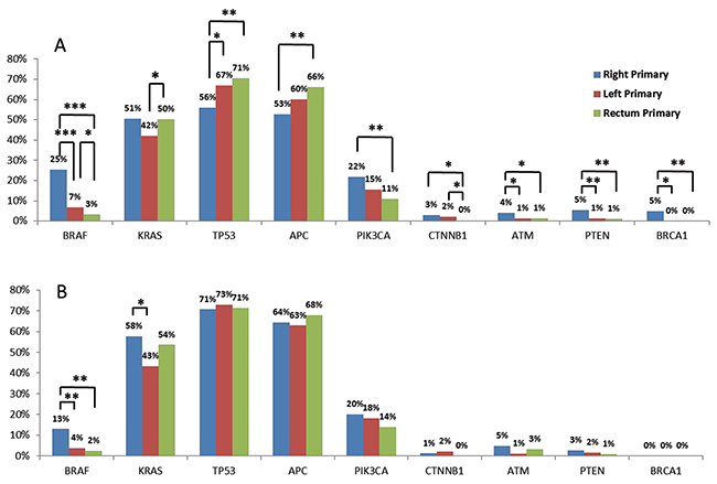 Figure 2: Gene mutation rates in primary tumors of right-sided colon tumors, left-sided colon tumors, and rectal tumors. * = p < 0.05, ** = p < 0.01, *** = p < 0.001 by Chi-squared tests. (A) Comparison in all primary tumors; (B) comparison in MMRp tumors.