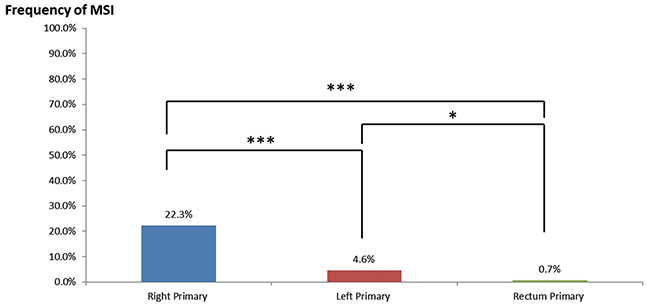 Figure 3: MMRd frequency in right-sided colon cancers, left-sided colon cancers, and rectal cancers. * = p < 0.05, *** = p < 0.001 by Chi-squared tests.