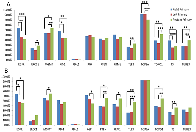 Figure 5: Protein expression rates in primary tumors of the right colon, left colon, and rectum. * = p < 0.05, ** = p < 0.01, *** = p < 0.001 by Chi-squared tests. (A) Comparison in all primary tumors; (B) comparison in MMRp tumors.