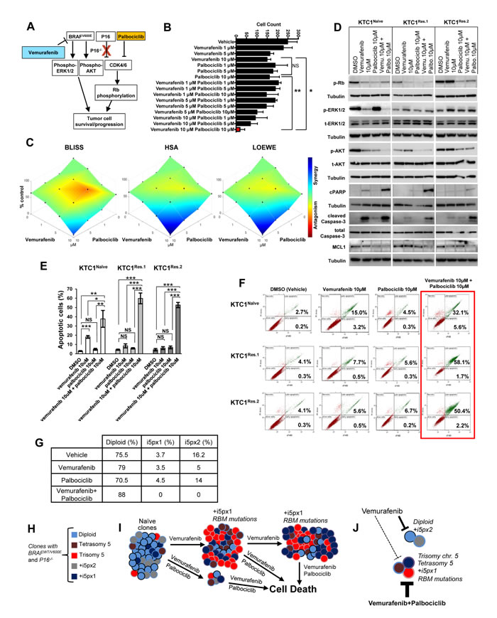 Figure 6: Combined therapy with vemurafenib plus palbociclib overcomes resistance to single agent treatments in PTC patient-derived cells with BRAFV600E and P16-/-. A. Diagram of a proposed targeted therapy strategy in human invasive thyroid carcinoma cells harboring the heterozygous BRAFV600E mutation and with P16 loss (P16-/-). B. Histogram shows cells number upon treatments with vehicle, vemurafenib, palbocilib, or combined therapy vemurafenib plus palbociclib; quantitative analysis was performed at 48 hours post-treatments by direct counting of adherent cells. These data represent the average ± standard deviation (error bars) of three replicates from two independent measurements. Statistical significance (*p <0.05; **p < 0.01; NS=not significant) was determined by one-way analysis of variance (ANOVA) using Tukey’s correction for multiple comparisons. C. Visualization of drug combinations: surface plots of naïve KTC1 cells treated vehicle, vemurafenib, palbocilib, or combined therapy vemurafenib plus palbociclib. Each point represents the mean of three replicates from two independent measurements. Plots were generated using Combenefit script by MATLAB R2017a by applying three methods for combined treatments: Bliss (effect-based approach); Highest Single Agent (HSA) (effect-based approach); and Loewe (dose-effect based approach). Level of antagonism or synergism is rapresented by color scale bar. D. Western blotting analysis of proteins expression levels at 24 hrs treatment with DMSO (vehicle), vemurafenib, palbocilib and combined therapy with vemurafenib plus palbocilib. These results were validated by two independent experiments. E. Quantification of apoptosis by annexin V and propidium iodide (PI) dual staining assay in KTC1Naive, KTC1Res.1 and KTC1Res.2 cells at 48 hrs treatment with DMSO (vehicle), 10 µM vemurafenib, 10 µM palbocilib and combined therapy with 10 µM vemurafenib + 10 µM palbocilib. These data represent the average ± standard deviation (error bars) of two independent replicate measurements (*p < 0.05, **p < 0.01, ***p < 0.001, NS=not significant). F. Representive Annexin V/PI Flow cytometry analysis of KTC1Naive, KTC1Res.1 and KTC1Res.2 cells at 48 hrs treatment with DMSO (vehicle), 10 µM vemurafenib, 10 µM palbocilib and combined therapy with 10 µM vemurafenib + 10 µM palbocilib. These data are representative of three independent replicate measurements (*p < 0.05, **p < 0.01, ***p < 0.001). G. Quantification of cell clones with either diploid or chromosome 5 aberrations assessed by interphase fluorescence in situ hybridization (FISH) analysis in KTC1Naive cells treated for 48 hrs with vehicle, 10 µM vemurafenib (vemu), 10 µM palbociclib (palbo) or 10 µM vemurafenib plus 10 µM palbociclib. These results were validated quantifying 200 cells by two independent replicate measurements. H. KTC1 cells harboring the BRAFV600E mutation and with P16 loss show heterogeneous clones which are diploid, aneuploidy (trisomy of chromosome 5, with one copy (+i5px1) or two copies (+i5px2) of isochromosome 5p), or with tetrasomy of chromosome 5 due to tetraploidy. I. Clonal selection and expansion of KTC1 cells during sustained treatment with vemurafenib; these selected clones acquire mutations in the RBM genes (e.g. RBMX, RBM10). J. Scheme of treatments with vemurafenib and palbociclib: dashed lines indicate that KTC1 cells clones with trisomy or tetrasomy of chromosome 5, +i5px1, or RBM mutations are resistant and less responsive to the single agent treatments. Whereas combined therapy with vemurafenib plus palbociclib (thick bold lines) significantly induces cell death and overcomes resistance to the single agent treatments by reducing clonal expansion of KTC1 cells with chromosome 5 aberrations.