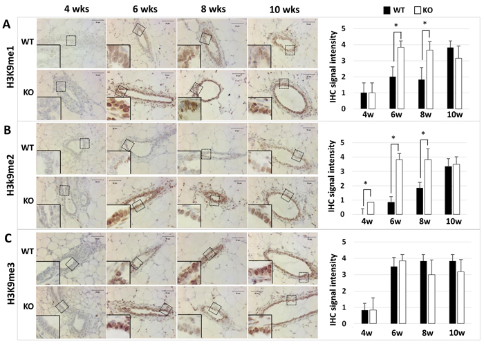 Figure 2: Detection of H3K9me1 (Panel A), H3K9me2 (Panel B), and H3K9me3 (Panel C) by IHC in the mammary glands of WT and Kdm3a KO mice at the indicated ages in weeks (wks). IHC (brown color) was performed using Kdm3a antibody with de-paraffinized mammary gland tissue sections prepared from 5 mice in each age and genotype group. Tissue slides were counter-stained with hematoxylin and imaged under microscope at the magnification of 200×. IHC-staining intensity was scored in a scale ranged from 0 to 4. The bar graphs present the average scores of 5 samples in each group. *, p < 0.05 by unpaired Student’s t test.